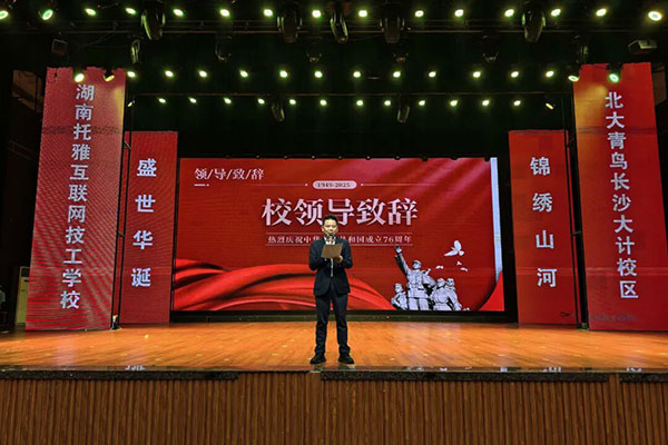 随后,龙正波校长发表了热情洋溢的致辞,向全体师生致以节日的问候,并强调了在青年学生中开展爱国主义教育的重要意义。校长指出,此次汇演不仅是才艺的展示,更是一堂生动的思政大课,希望同学们能将爱国情、强国志、报国行自觉融入未来的学习与生活中。