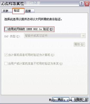 第四步,点击“验证”标签页,将“起用此网络的IEEE 802.1x验证”前的勾取消,按确定。