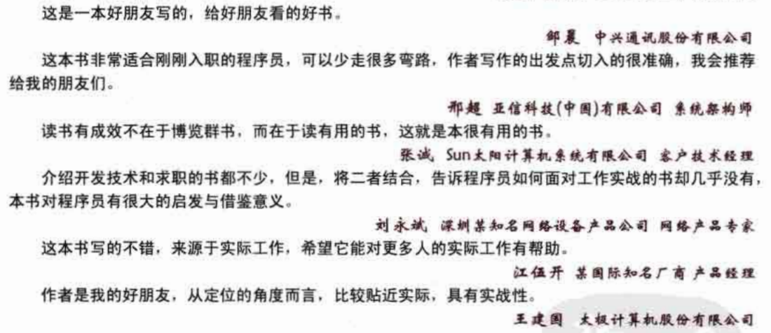 书中浓缩了程序员求职与工作、生存与发展的点滴经验,希望本书能够成为你的朋友。望本书能让即将走向工作岗位的程序员和已经成为程序员的朋友,对工作和软件行业做到既“知己”又“知彼”,在入职前对职业状况清楚了解,入职后对职业方向清晰认识,使大家的工作更加得心应手,更加轻松愉快。