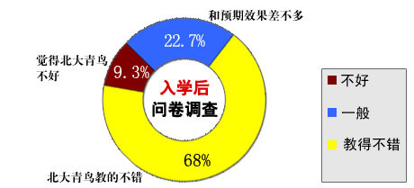 在进行学习一年后,重新对1024位学员进行问卷调查,其中68%学员表示北大青鸟教得不错、22.7%学员表示和预期的差不多,只有9.3%学员表示北大青鸟不好。